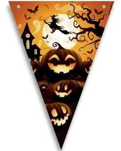 Unsere blutige Halloweengirlande mit Handabdruck kommt mit einer Länge von etwa 5 Metern. An ihr sind 10 Wimpel befestigt, die mit Blutspritzern und Handabdrücken versehen sind. Die Befestigung an der Wand ist denkbar einfach. Entdecke auch unsere Bunte Happy Halloween Girlande oder die Folterwerkzeug Girlande für deinen Folterkeller!