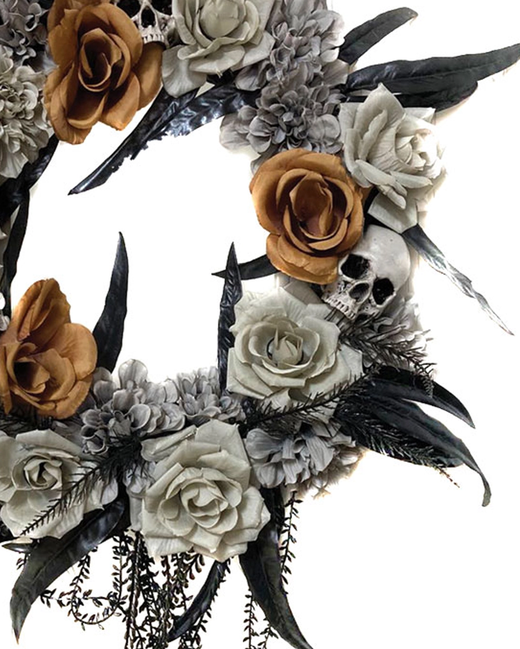 Morbide Halloween Tür Dekoration mit Blumen, Federn & Totenköpfen