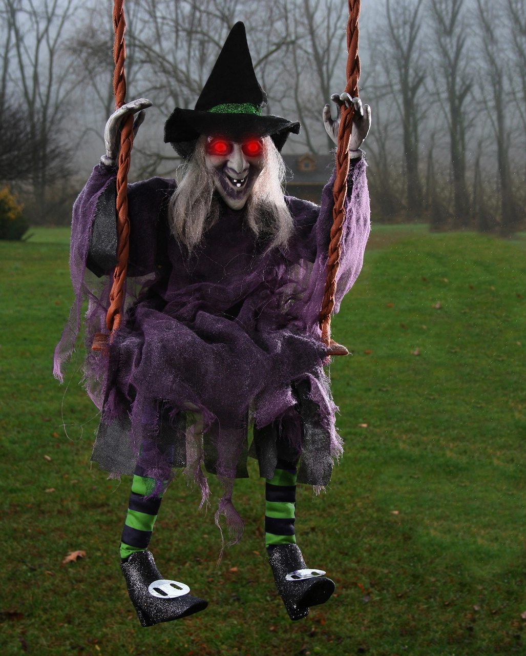 Verwandle deinen Garten in ein Gruselkabinett mit unserer leuchtenden Hexe auf Schaukel 90 cm! Die realistische Zauberin zum Aufhängen mit roten LED Augen wird an Halloween, Walpurgisnacht und auf Grusel Partys mit Sicherheit zum absoluten Blickfang!