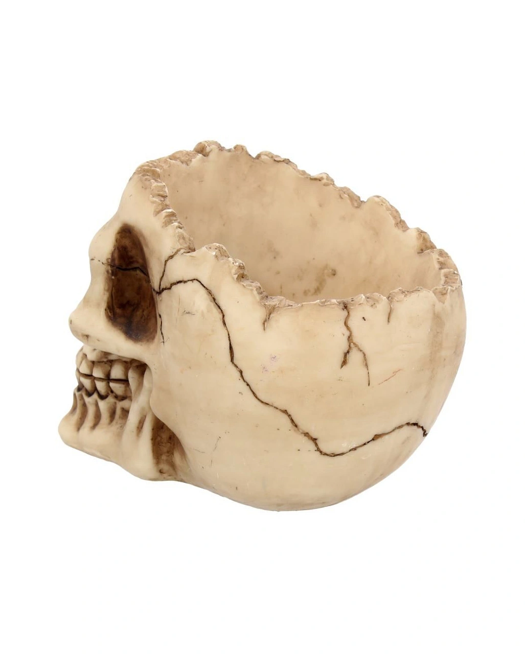 Diese morbide Halloween Tischdeko ist ein vielseitiger Totenkopf Dekoartikel. Die Totenschädel Schale lässt sich als unheimliche Skull Vase für deine Pflanzen nutzen. Mit etwas Blumenerde und Pflanzensamen erwacht aus dem Totenkopf schon bald neues Leben. Auch als Aschenbecher für die nächste Party macht sich der Kunststein Deko Totenkopf mit offener Schädeldecke ideal! Du suchst eine Aufbewahrung für deinen Schmuck? Dann kommt diese Totenschädel Schale genau richtig! Entdecke noch mehr praktische Totenkopf Deko und Totenschädel Geschenkideen in unserem Onlineshop.
